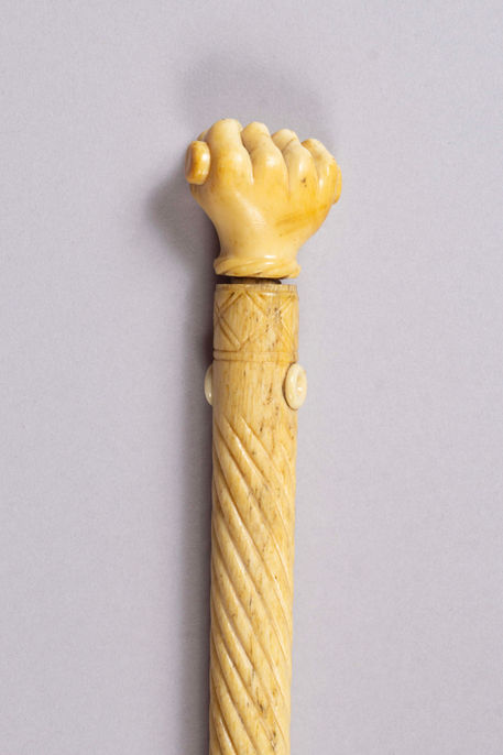 A great antique scrimshaw cane with whale ivory carved clenched fist holding rod. Cable rope design, crosshatching on bottom wrapped in Baleen; Whale Ivory/Bone with old brass tip; Ca. 1850s; 32"Tall, 1 3/4" Wide fist; 2 pounds; NOTE: This is an ESA antique exempt piece of ivory and cannot be sold internationally or to anyone residing in the states of California, Hawaii, Illinois, Nevada, New Hampshire, New Jersey, New York, Oregon, or Washington. We guarantee that the piece was made prior to 1972.