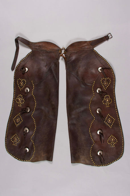 Marked "C.P. Shipley, Kan., City, MO", dark brown color with studded brass tack trim, tack card suit emblems on each leg. Ca. 1950s