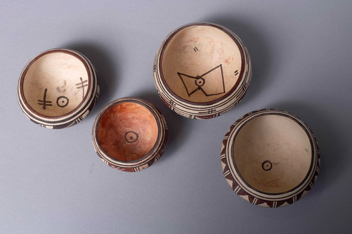 Four Hopi Bowls, Delaine Tootsie Chee (b. 1962) of the First Mesa Village of Sichomovi on the Hopi Reservation and is a member of the Roadrunner Clan. She is the winner of numerous awards for her pottery. These pots are hand-coiled of local clay, stone-polished, and outdoor-fired to a warm ivory tone, each bowl decorated in iron-red and black mineral/vegetal paints with traditional motifs, each base inscribed “D. TooTsie. Asa. Hopi”