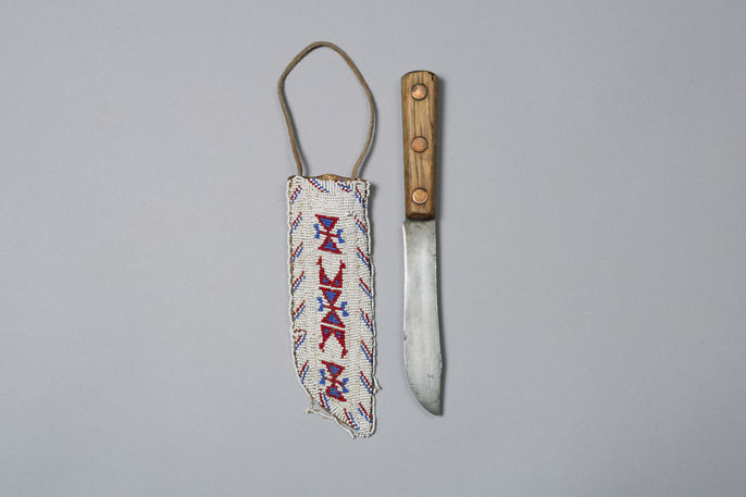 Deer hide sheath stitched in white, red, and blue seed beads, decorated with classic stepped geometric motifs and diagonal bar accents; fitted with a simple wood-handled knife