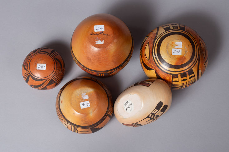 This lot features a charming collection of five smaller redware vessels, representing a variety of traditional Hopi forms and artistry. The pots are hand-coiled and hand-polished, with black and red designs characteristic of Hopi pottery, applied with natural mineral and organic pigments on a polished red clay slip.