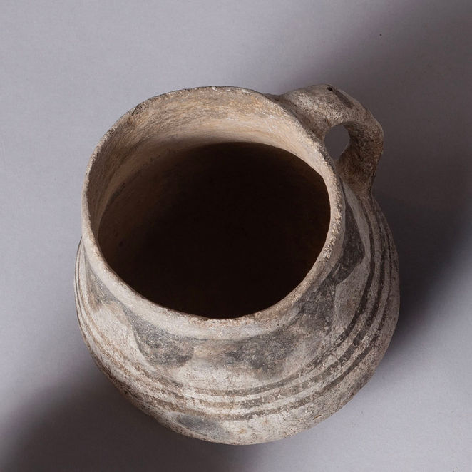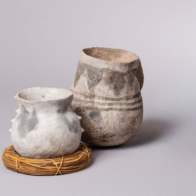 The pottery was hand-built using a coiled technique and features matte black painted geometric designs on a white surface or gray clay, a sizable form with a piriform body.