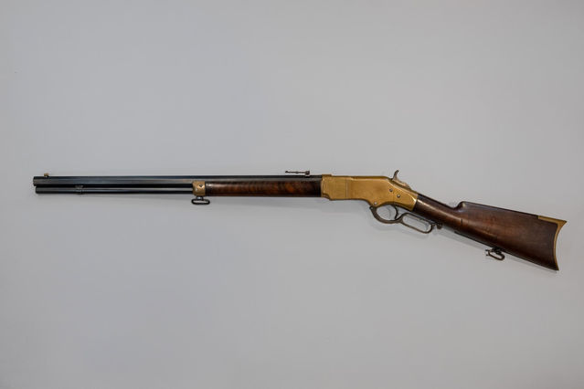 Very orignial high condition and very desirable Winchester Model 1866 Rifle. Cal. 44 Rim Fire; Condition of finish: barrell and magazine tube 90-95%, wood in original high condition, few small nicks, Original sling swivels, the receiver and rifle butt platehave that wonderful mustard color that is so desirable - Never cleaned. Small old chip in toe of stock. Henry Rifle rear site.