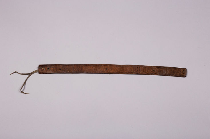 Northern Plains beaded hat band. Constructed from an old commercial leather belt with beaded panels and geometric designs, sinew sewn.