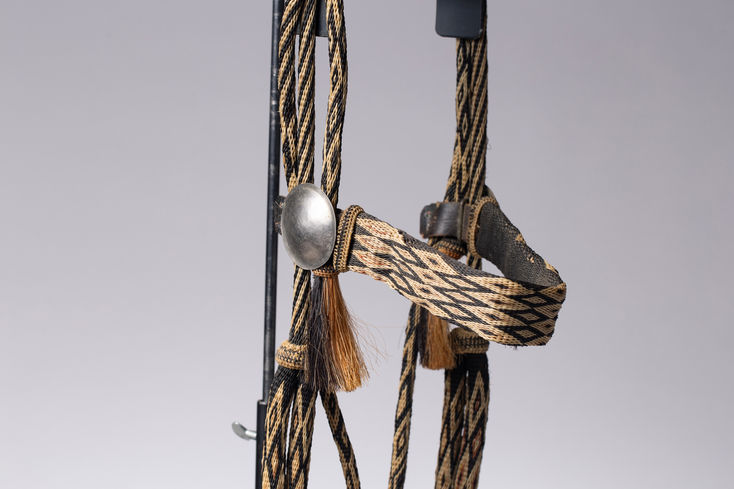 This is a stunning and highly collectible work of Western folk art, meticulously crafted by an inmate at the historic Montana State Prison in Deer Lodge. The bridle features the intricate and time-consuming technique of "hitching," where horsehair is tightly knotted into complex geometric patterns. Woven in great natural colors of horsehair, including blacks, whites, and browns, the bridle highlights the striking visual contrast of the materials. A classic and highly-detailed diamond pattern is expertly executed throughout the headstall, browband, and cheeks. Ornate, nickel conchos provide an eye-catching decorative detail, a common feature of this distinctive folk art tradition. The bridle is completed with its original iron prison bit, adding to its authenticity and historical significance for serious collectors.