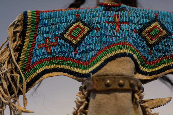 An exceptional and finely crafted Sioux beaded doll, dating from the late 19th to early 20th century. This exquisite piece of Native American art features intricate detail and superior craftsmanship, making it a highly desirable collectible. The doll's attire is a testament to the maker's skill, from the carefully prepared brain-tanned hide to the complex geometric beadwork. The doll's dress is made of soft hide and adorned with geometric beadwork and long fringe. The doll wears a leather belt with tacks and a beaded knife sheath. A miniature, detachable knife with a bone handle is included and fits into the sheath.